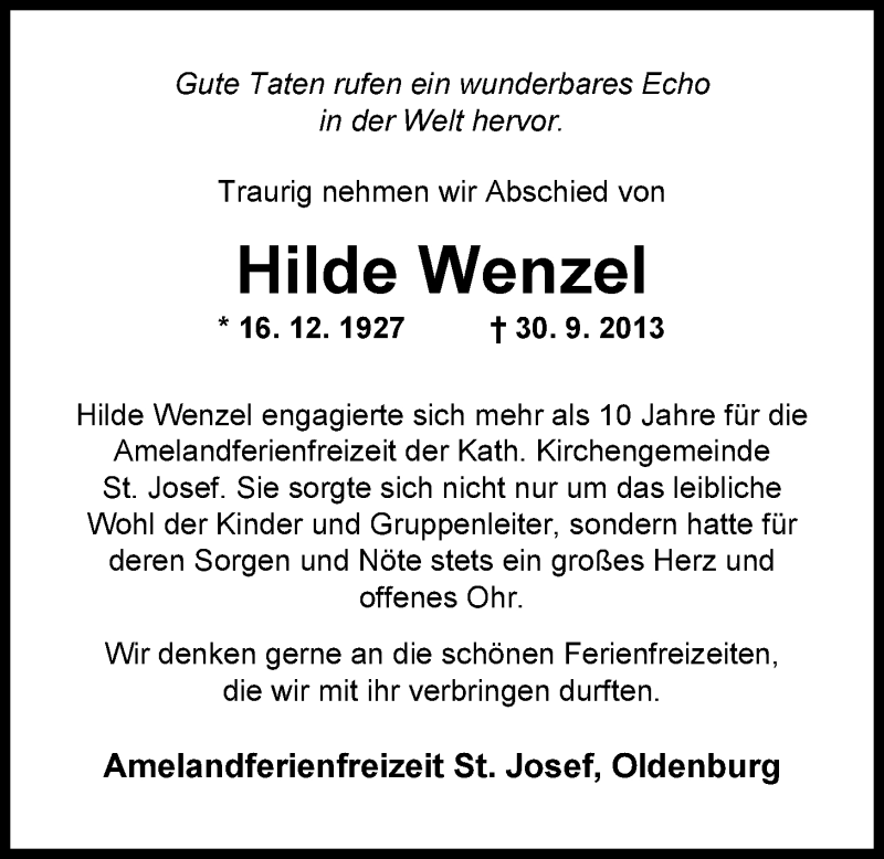 Hier finden Sie alle Traueranzeigen aus der Zeitung, die bisher für Hildegard Wenzel erschienen sind. Weitere Traueranzeigen, die in der Zeitung erscheinen, werden hier ebenfalls aufgelistet