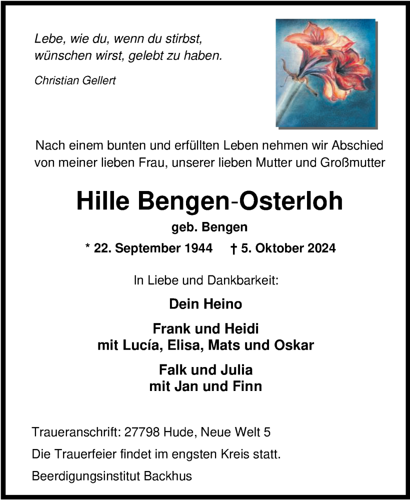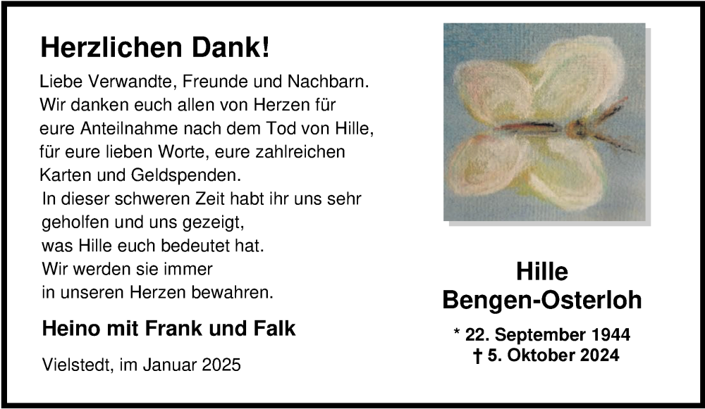 Hier finden Sie alle Traueranzeigen aus der Zeitung, die bisher für Hille Bengen-Osterloh erschienen sind. Weitere Traueranzeigen, die in der Zeitung erscheinen, werden hier ebenfalls aufgelistet