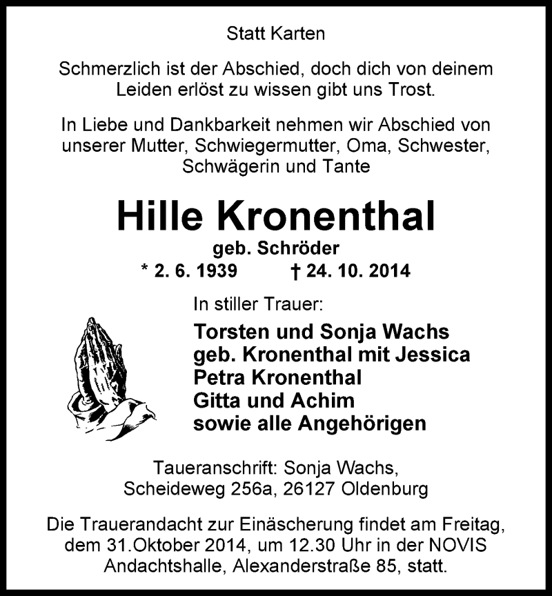 Hier finden Sie alle Traueranzeigen aus der Zeitung, die bisher für Hille Kronenthal erschienen sind. Weitere Traueranzeigen, die in der Zeitung erscheinen, werden hier ebenfalls aufgelistet