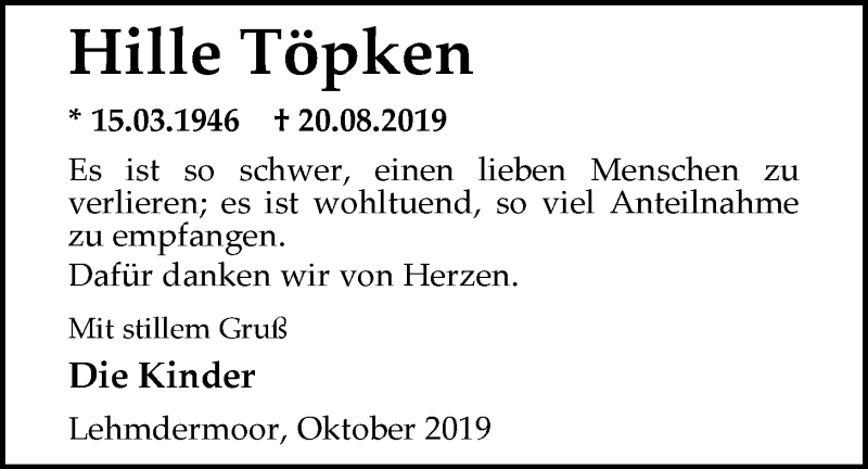 Hier finden Sie alle Traueranzeigen aus der Zeitung, die bisher für Hille Töpken erschienen sind. Weitere Traueranzeigen, die in der Zeitung erscheinen, werden hier ebenfalls aufgelistet