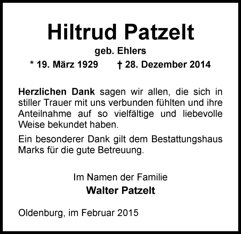 Hier finden Sie alle Traueranzeigen aus der Zeitung, die bisher für Hiltrud Patzelt erschienen sind. Weitere Traueranzeigen, die in der Zeitung erscheinen, werden hier ebenfalls aufgelistet