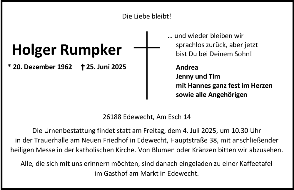 Hier finden Sie alle Traueranzeigen aus der Zeitung, die bisher für Holger Rumpker erschienen sind. Weitere Traueranzeigen, die in der Zeitung erscheinen, werden hier ebenfalls aufgelistet