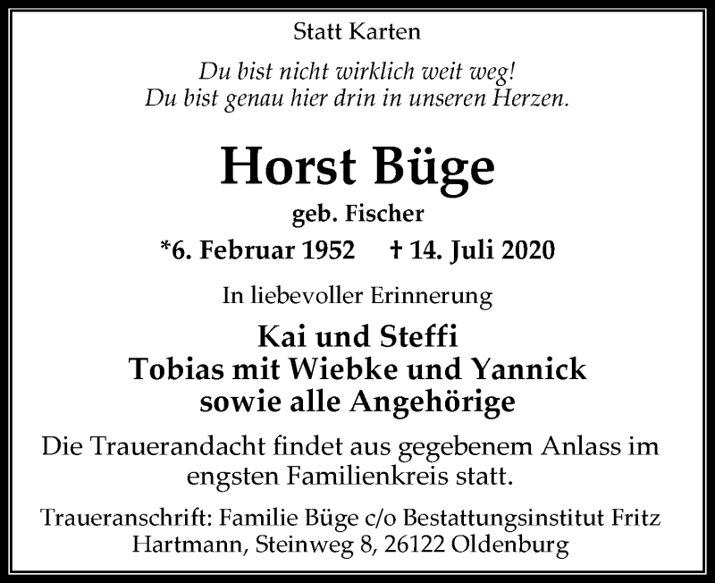 Hier finden Sie alle Traueranzeigen aus der Zeitung, die bisher für Horst Büge erschienen sind. Weitere Traueranzeigen, die in der Zeitung erscheinen, werden hier ebenfalls aufgelistet