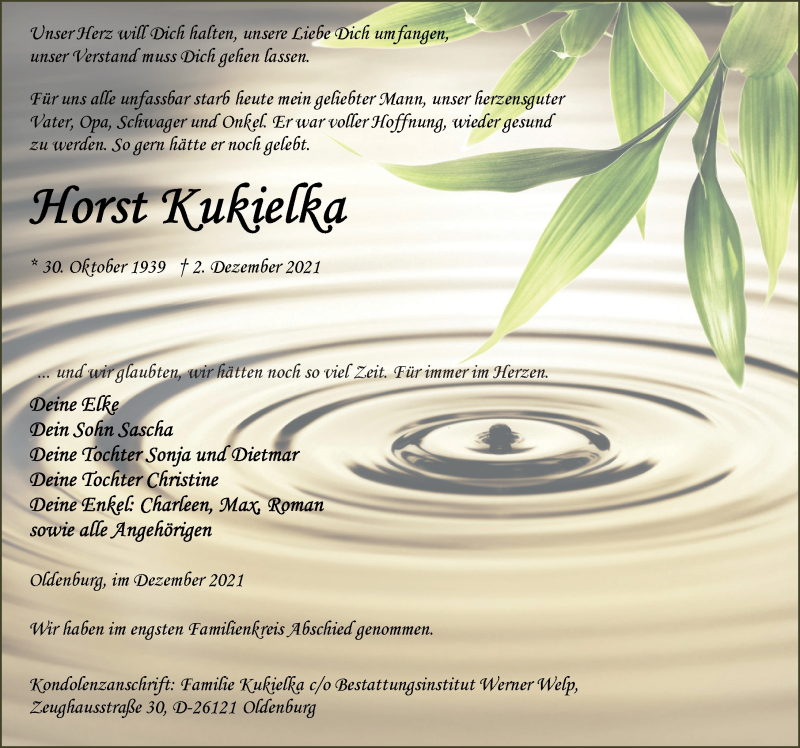 Hier finden Sie alle Traueranzeigen aus der Zeitung, die bisher für Horst Kukielka erschienen sind. Weitere Traueranzeigen, die in der Zeitung erscheinen, werden hier ebenfalls aufgelistet