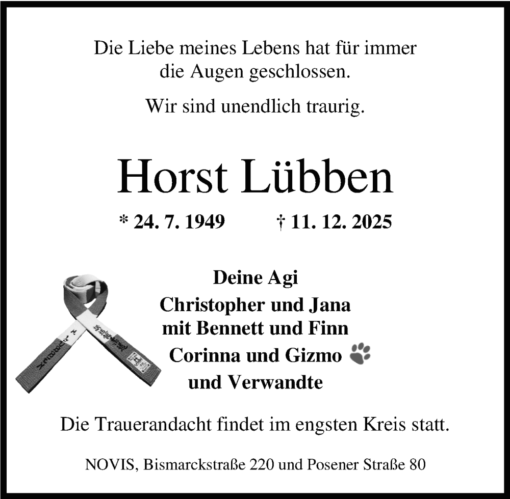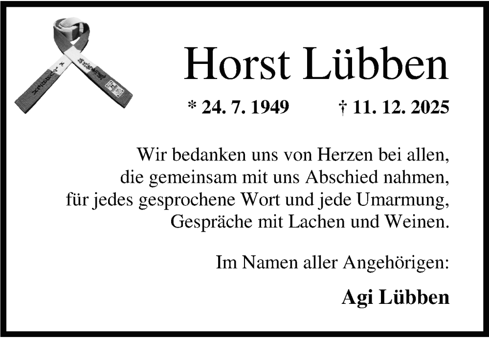 Hier finden Sie alle Traueranzeigen aus der Zeitung, die bisher für Horst Lübben erschienen sind. Weitere Traueranzeigen, die in der Zeitung erscheinen, werden hier ebenfalls aufgelistet