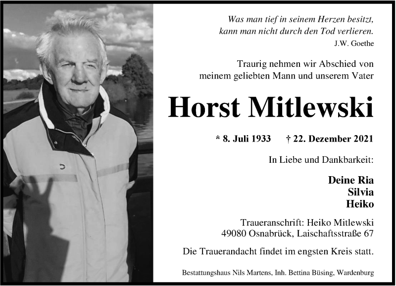 Hier finden Sie alle Traueranzeigen aus der Zeitung, die bisher für Horst Mitlewski erschienen sind. Weitere Traueranzeigen, die in der Zeitung erscheinen, werden hier ebenfalls aufgelistet