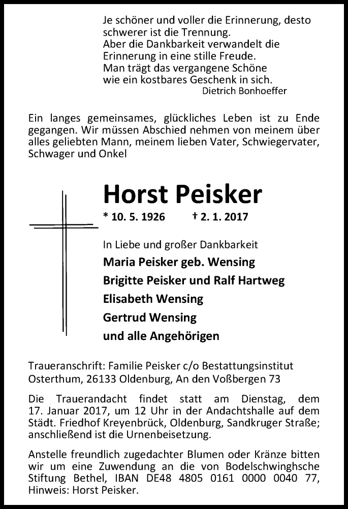 Hier finden Sie alle Traueranzeigen aus der Zeitung, die bisher für Horst Peisker erschienen sind. Weitere Traueranzeigen, die in der Zeitung erscheinen, werden hier ebenfalls aufgelistet