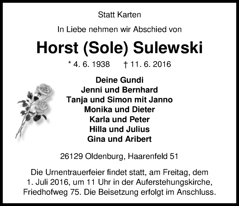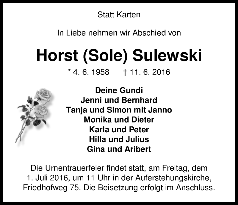 Hier finden Sie alle Traueranzeigen aus der Zeitung, die bisher für Horst Sulewski erschienen sind. Weitere Traueranzeigen, die in der Zeitung erscheinen, werden hier ebenfalls aufgelistet