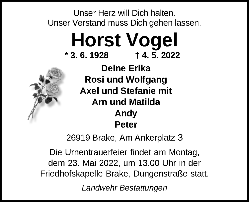 Hier finden Sie alle Traueranzeigen aus der Zeitung, die bisher für Horst Vogel erschienen sind. Weitere Traueranzeigen, die in der Zeitung erscheinen, werden hier ebenfalls aufgelistet