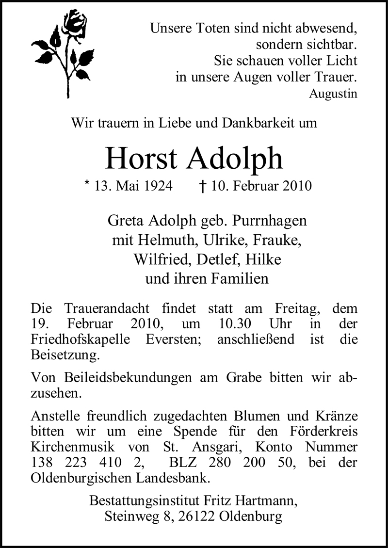 Hier finden Sie alle Traueranzeigen aus der Zeitung, die bisher für Horst Adolph erschienen sind. Weitere Traueranzeigen, die in der Zeitung erscheinen, werden hier ebenfalls aufgelistet