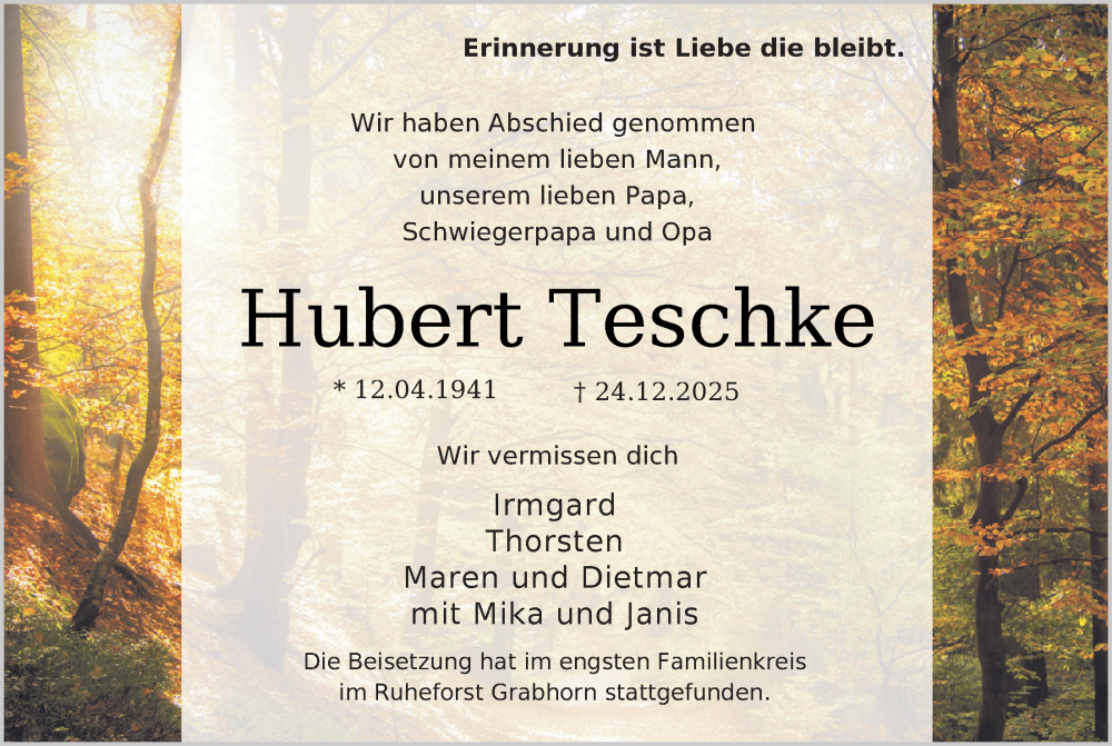 Hier finden Sie alle Traueranzeigen aus der Zeitung, die bisher für Hubert Teschke erschienen sind. Weitere Traueranzeigen, die in der Zeitung erscheinen, werden hier ebenfalls aufgelistet