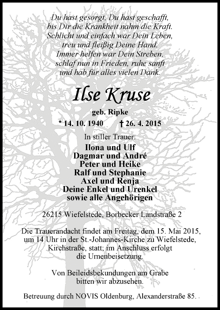 Hier finden Sie alle Traueranzeigen aus der Zeitung, die bisher für Ilse Kruse erschienen sind. Weitere Traueranzeigen, die in der Zeitung erscheinen, werden hier ebenfalls aufgelistet
