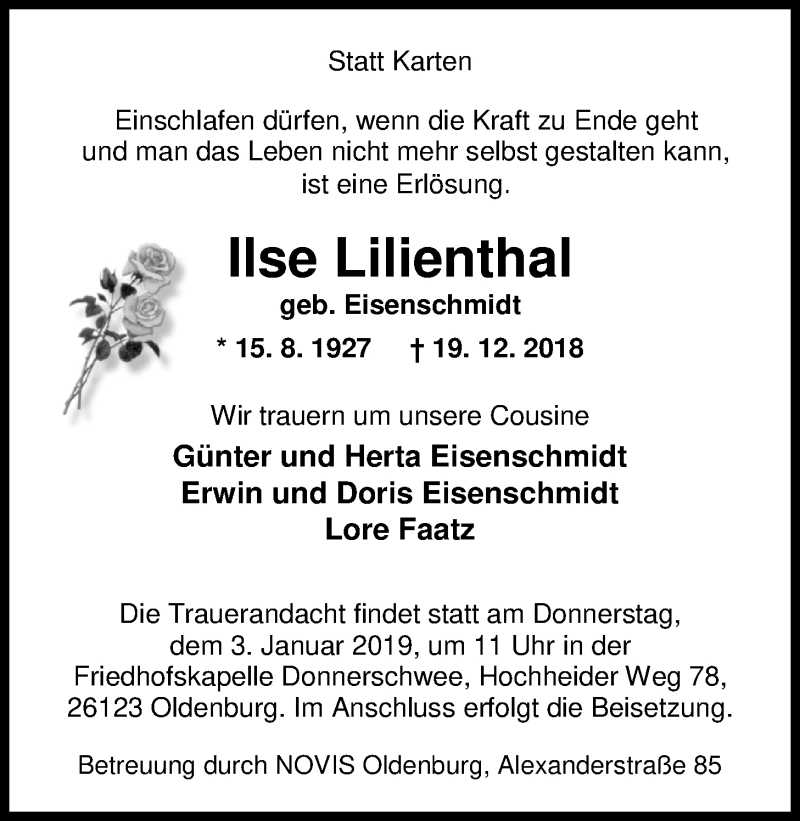 Hier finden Sie alle Traueranzeigen aus der Zeitung, die bisher für Ilse Lilienthal erschienen sind. Weitere Traueranzeigen, die in der Zeitung erscheinen, werden hier ebenfalls aufgelistet