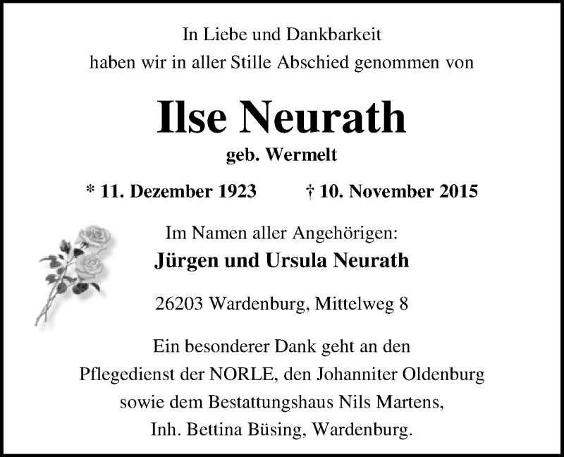 Hier finden Sie alle Traueranzeigen aus der Zeitung, die bisher für Ilse Neurath erschienen sind. Weitere Traueranzeigen, die in der Zeitung erscheinen, werden hier ebenfalls aufgelistet
