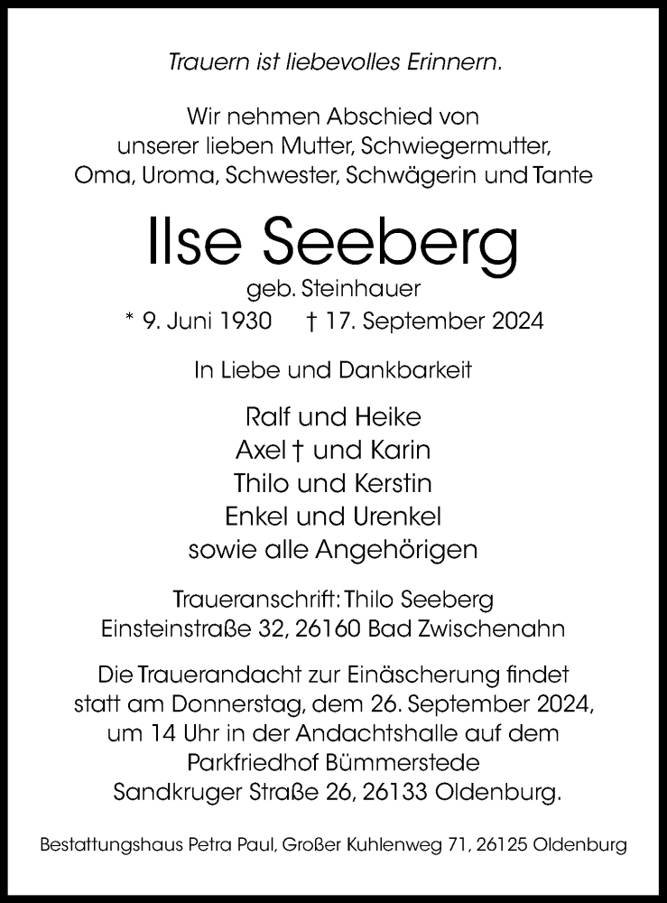 Hier finden Sie alle Traueranzeigen aus der Zeitung, die bisher für Ilse Seeberg erschienen sind. Weitere Traueranzeigen, die in der Zeitung erscheinen, werden hier ebenfalls aufgelistet