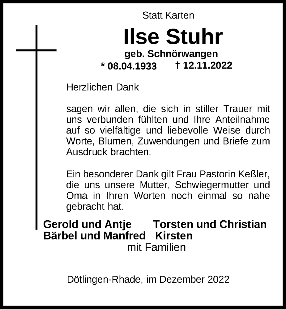 Hier finden Sie alle Traueranzeigen aus der Zeitung, die bisher für Ilse Stuhr erschienen sind. Weitere Traueranzeigen, die in der Zeitung erscheinen, werden hier ebenfalls aufgelistet