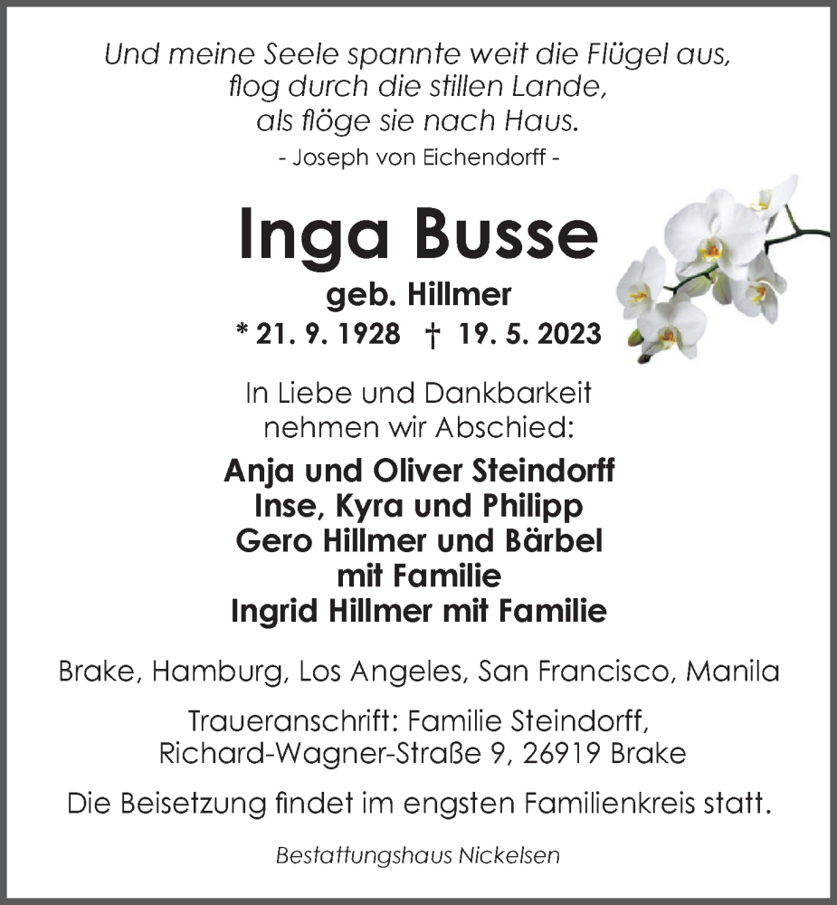 Hier finden Sie alle Traueranzeigen aus der Zeitung, die bisher für Inga Busse erschienen sind. Weitere Traueranzeigen, die in der Zeitung erscheinen, werden hier ebenfalls aufgelistet