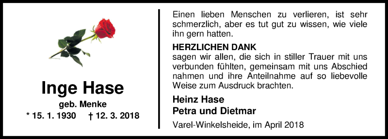 Hier finden Sie alle Traueranzeigen aus der Zeitung, die bisher für Inge Hase erschienen sind. Weitere Traueranzeigen, die in der Zeitung erscheinen, werden hier ebenfalls aufgelistet
