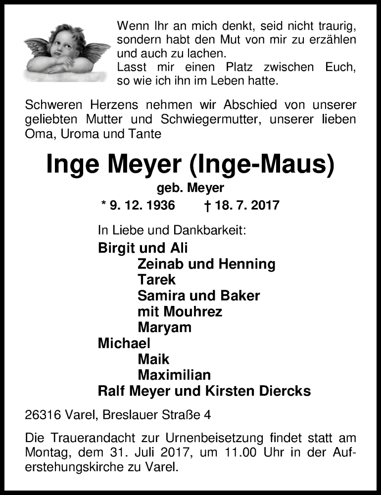 Hier finden Sie alle Traueranzeigen aus der Zeitung, die bisher für Inge (Inge-Maus) Meyer erschienen sind. Weitere Traueranzeigen, die in der Zeitung erscheinen, werden hier ebenfalls aufgelistet