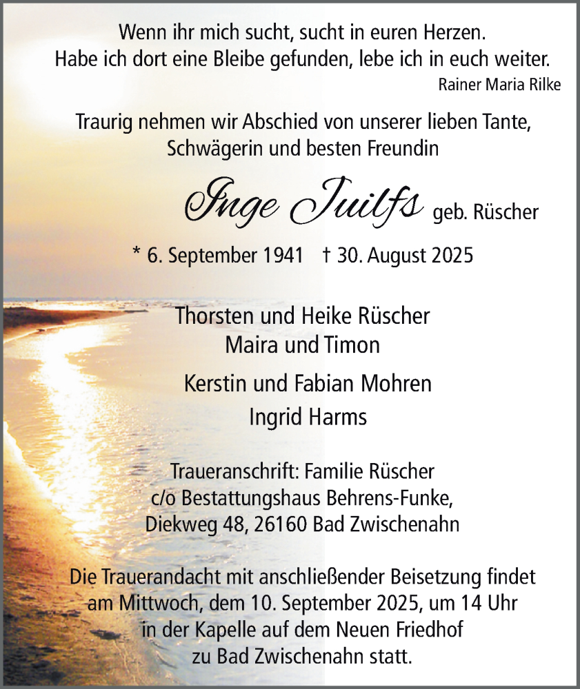 Hier finden Sie alle Traueranzeigen aus der Zeitung, die bisher für Inge Juilfs erschienen sind. Weitere Traueranzeigen, die in der Zeitung erscheinen, werden hier ebenfalls aufgelistet