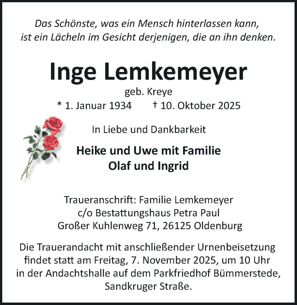 Hier finden Sie alle Traueranzeigen aus der Zeitung, die bisher für Inge Lemkemeyer erschienen sind. Weitere Traueranzeigen, die in der Zeitung erscheinen, werden hier ebenfalls aufgelistet