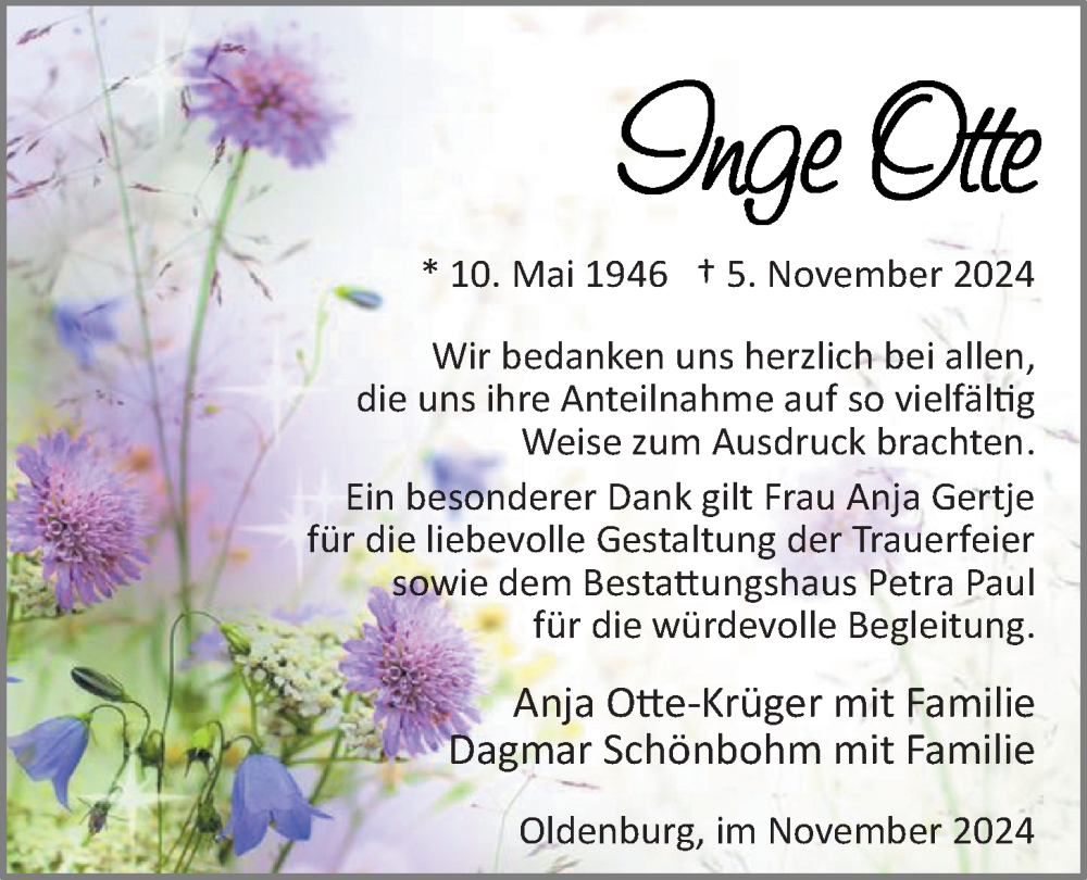 Hier finden Sie alle Traueranzeigen aus der Zeitung, die bisher für Inge Otte erschienen sind. Weitere Traueranzeigen, die in der Zeitung erscheinen, werden hier ebenfalls aufgelistet