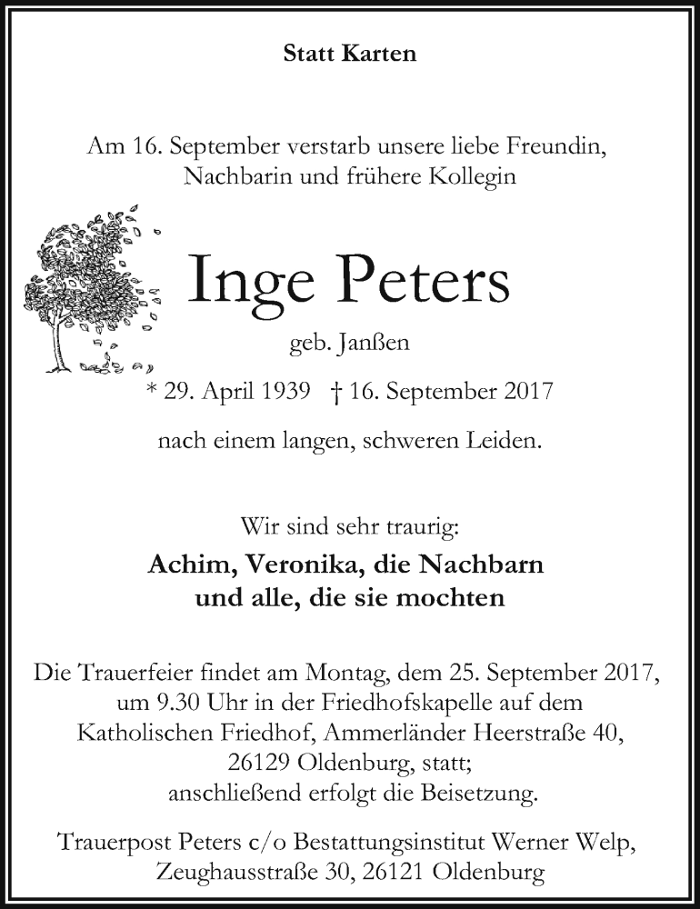 Hier finden Sie alle Traueranzeigen aus der Zeitung, die bisher für Inge Peters erschienen sind. Weitere Traueranzeigen, die in der Zeitung erscheinen, werden hier ebenfalls aufgelistet