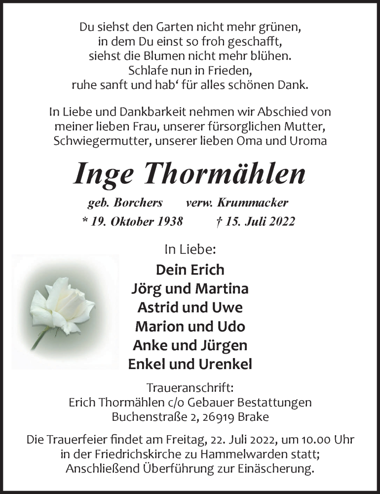 Hier finden Sie alle Traueranzeigen aus der Zeitung, die bisher für Inge Thormählen erschienen sind. Weitere Traueranzeigen, die in der Zeitung erscheinen, werden hier ebenfalls aufgelistet