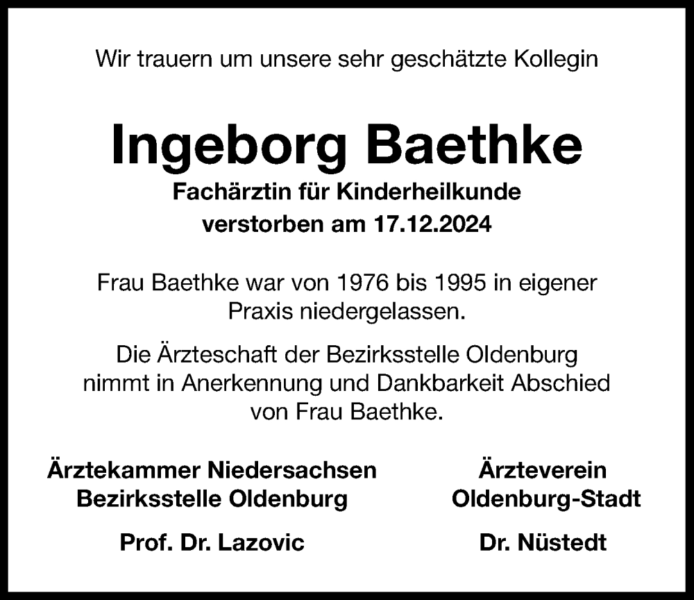 Hier finden Sie alle Traueranzeigen aus der Zeitung, die bisher für Ingeborg Baethke erschienen sind. Weitere Traueranzeigen, die in der Zeitung erscheinen, werden hier ebenfalls aufgelistet