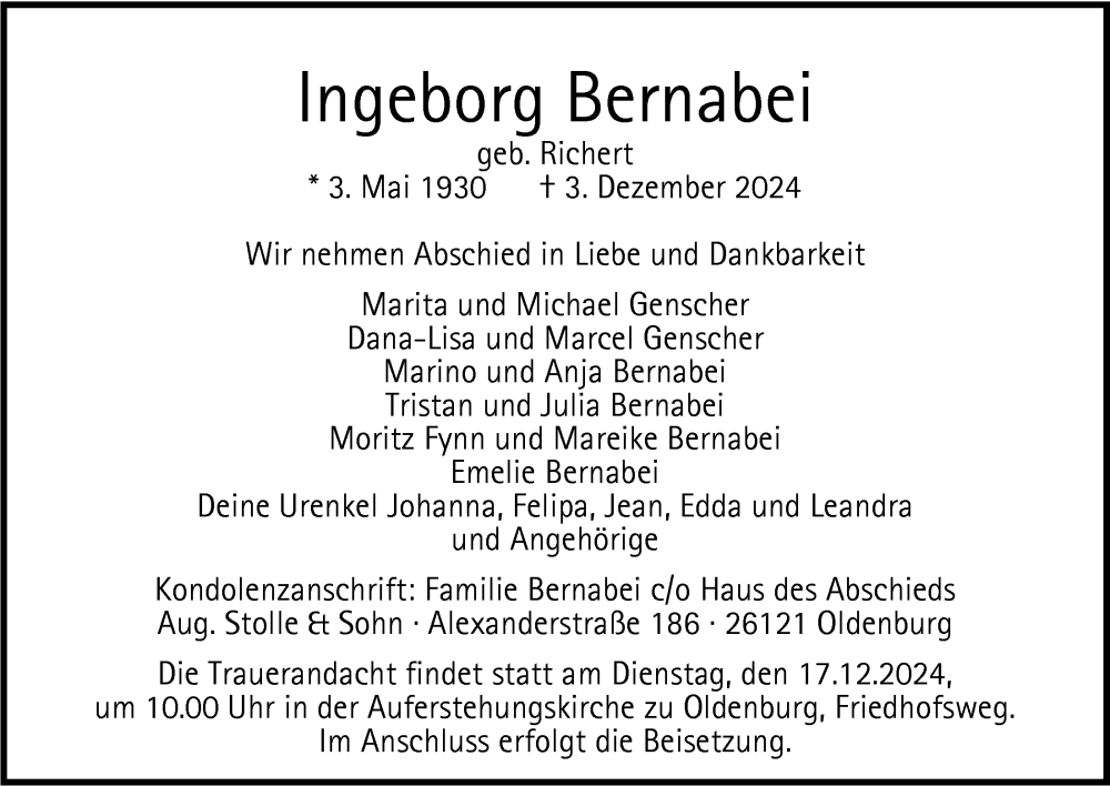 Hier finden Sie alle Traueranzeigen aus der Zeitung, die bisher für Ingeborg Bernabei erschienen sind. Weitere Traueranzeigen, die in der Zeitung erscheinen, werden hier ebenfalls aufgelistet