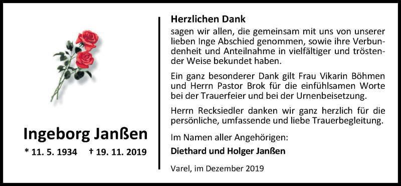 Hier finden Sie alle Traueranzeigen aus der Zeitung, die bisher für Ingeborg Janßen erschienen sind. Weitere Traueranzeigen, die in der Zeitung erscheinen, werden hier ebenfalls aufgelistet