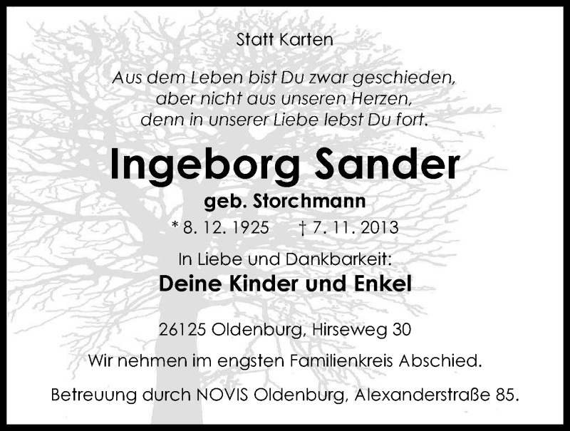 Hier finden Sie alle Traueranzeigen aus der Zeitung, die bisher für Ingeborg Sander erschienen sind. Weitere Traueranzeigen, die in der Zeitung erscheinen, werden hier ebenfalls aufgelistet