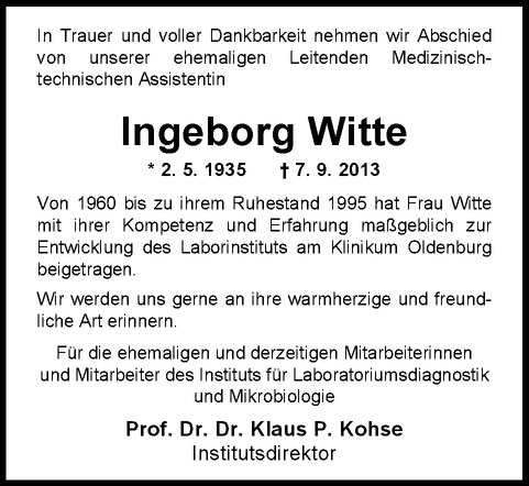 Hier finden Sie alle Traueranzeigen aus der Zeitung, die bisher für Ingeborg Witte erschienen sind. Weitere Traueranzeigen, die in der Zeitung erscheinen, werden hier ebenfalls aufgelistet