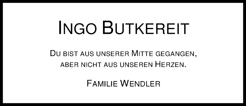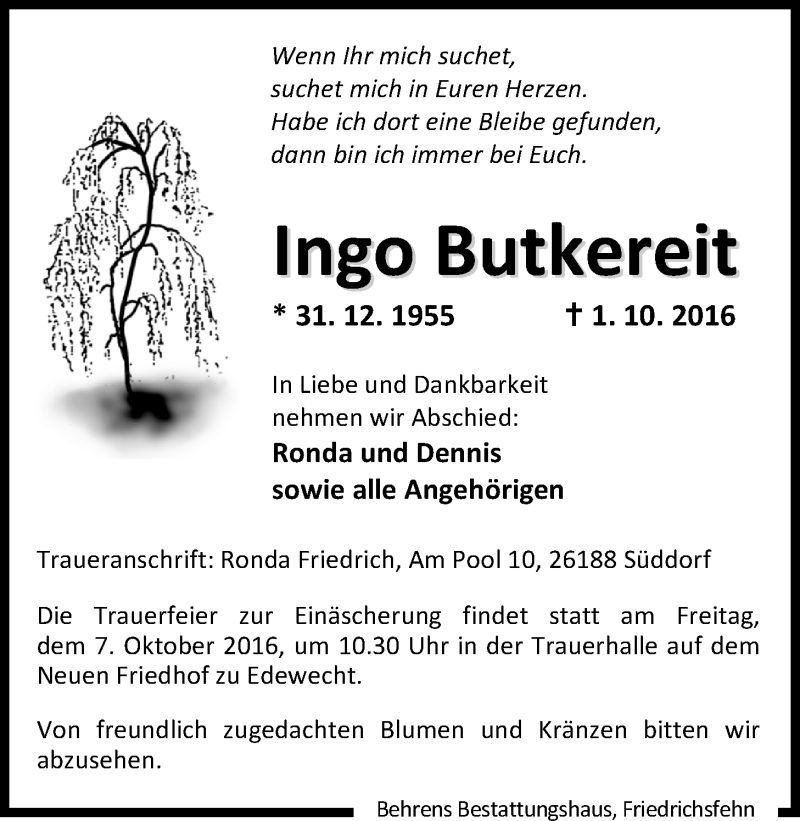 Hier finden Sie alle Traueranzeigen aus der Zeitung, die bisher für Ingo Butkereit erschienen sind. Weitere Traueranzeigen, die in der Zeitung erscheinen, werden hier ebenfalls aufgelistet