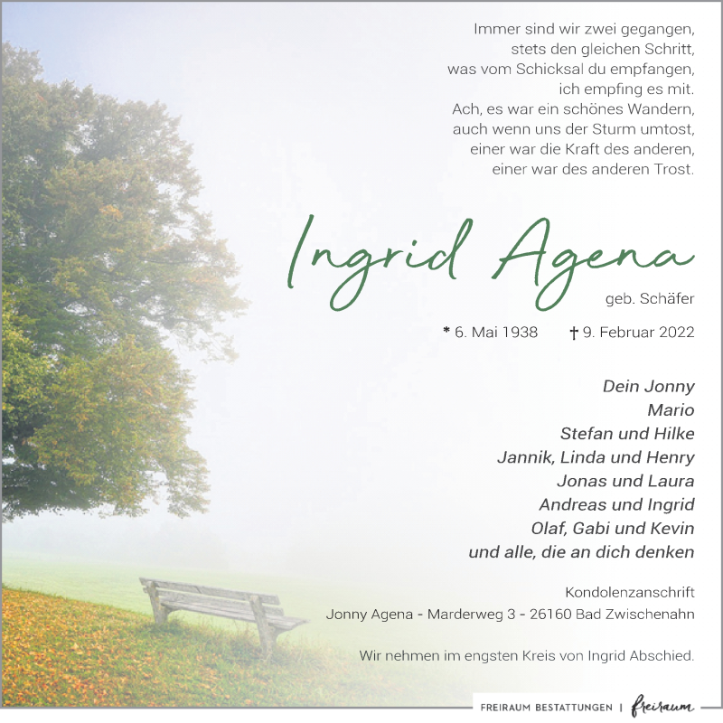 Hier finden Sie alle Traueranzeigen aus der Zeitung, die bisher für Ingrid Agena erschienen sind. Weitere Traueranzeigen, die in der Zeitung erscheinen, werden hier ebenfalls aufgelistet