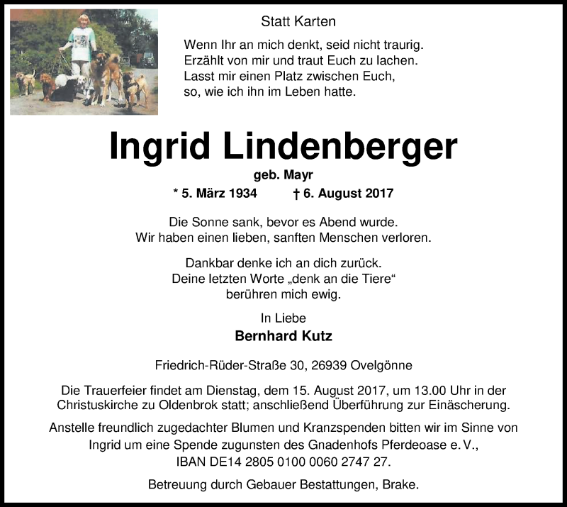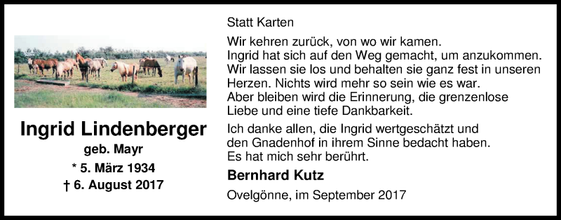 Hier finden Sie alle Traueranzeigen aus der Zeitung, die bisher für Ingrid Lindenberger erschienen sind. Weitere Traueranzeigen, die in der Zeitung erscheinen, werden hier ebenfalls aufgelistet