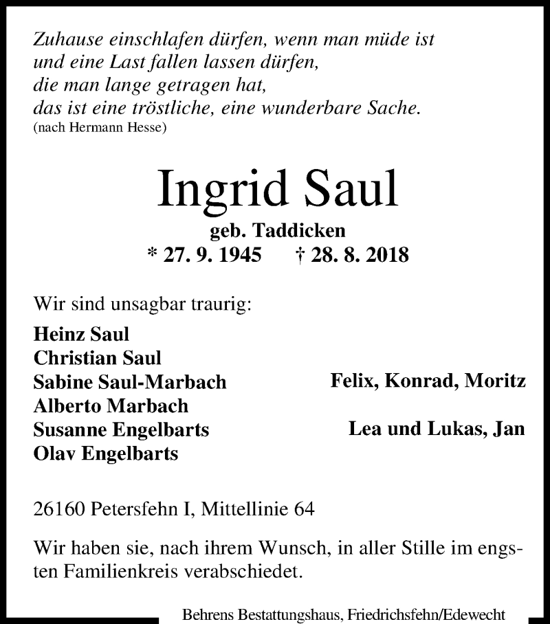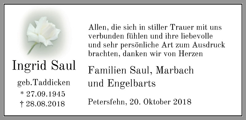 Hier finden Sie alle Traueranzeigen aus der Zeitung, die bisher für Ingrid Saul erschienen sind. Weitere Traueranzeigen, die in der Zeitung erscheinen, werden hier ebenfalls aufgelistet