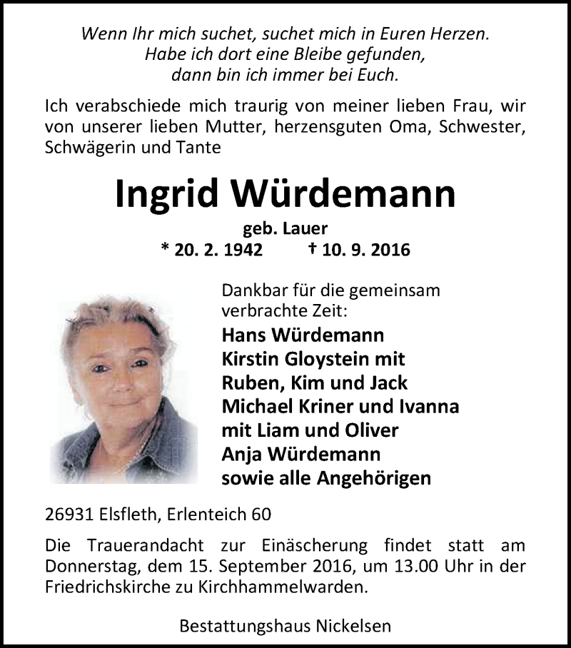 Hier finden Sie alle Traueranzeigen aus der Zeitung, die bisher für Ingrid Würdemann erschienen sind. Weitere Traueranzeigen, die in der Zeitung erscheinen, werden hier ebenfalls aufgelistet