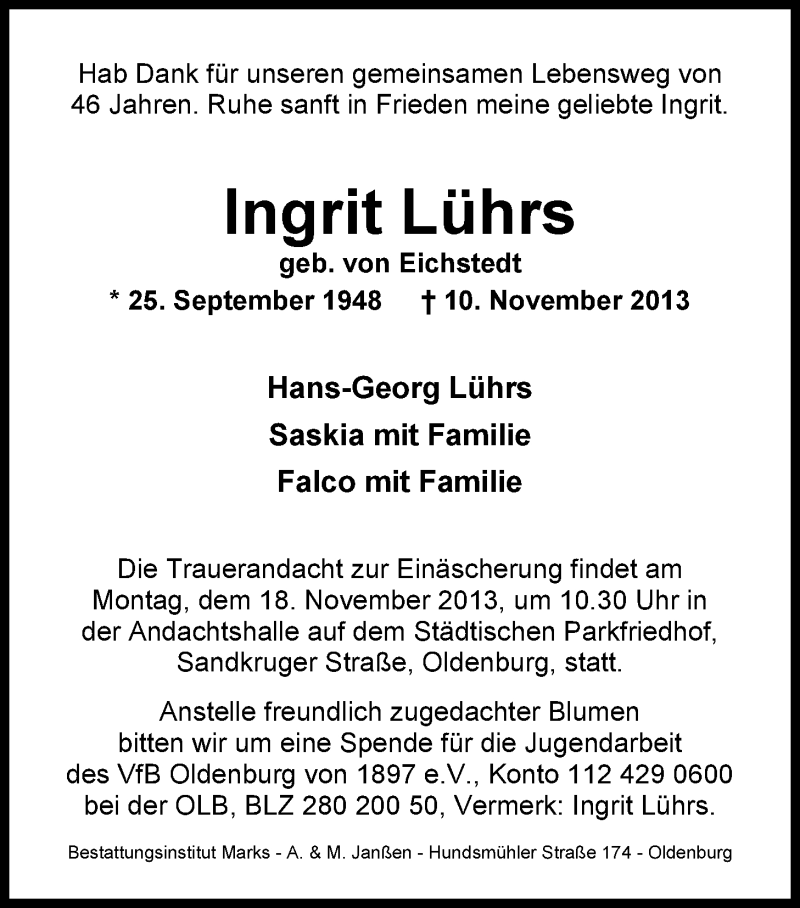Hier finden Sie alle Traueranzeigen aus der Zeitung, die bisher für Ingrit Lührs erschienen sind. Weitere Traueranzeigen, die in der Zeitung erscheinen, werden hier ebenfalls aufgelistet