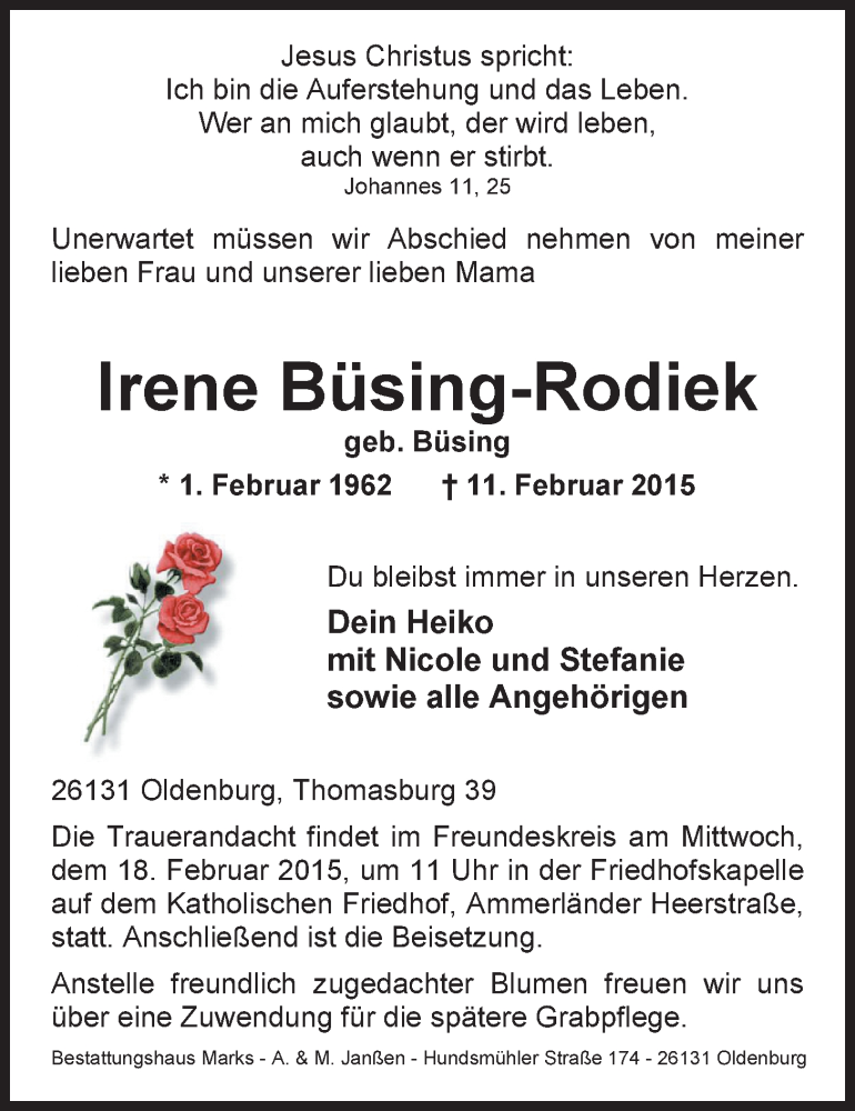Hier finden Sie alle Traueranzeigen aus der Zeitung, die bisher für Irene Büsing-Rodiek erschienen sind. Weitere Traueranzeigen, die in der Zeitung erscheinen, werden hier ebenfalls aufgelistet