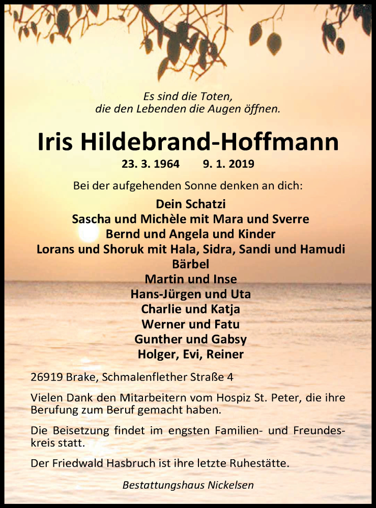 Hier finden Sie alle Traueranzeigen aus der Zeitung, die bisher für Iris Hildebrand-Hoffmann erschienen sind. Weitere Traueranzeigen, die in der Zeitung erscheinen, werden hier ebenfalls aufgelistet