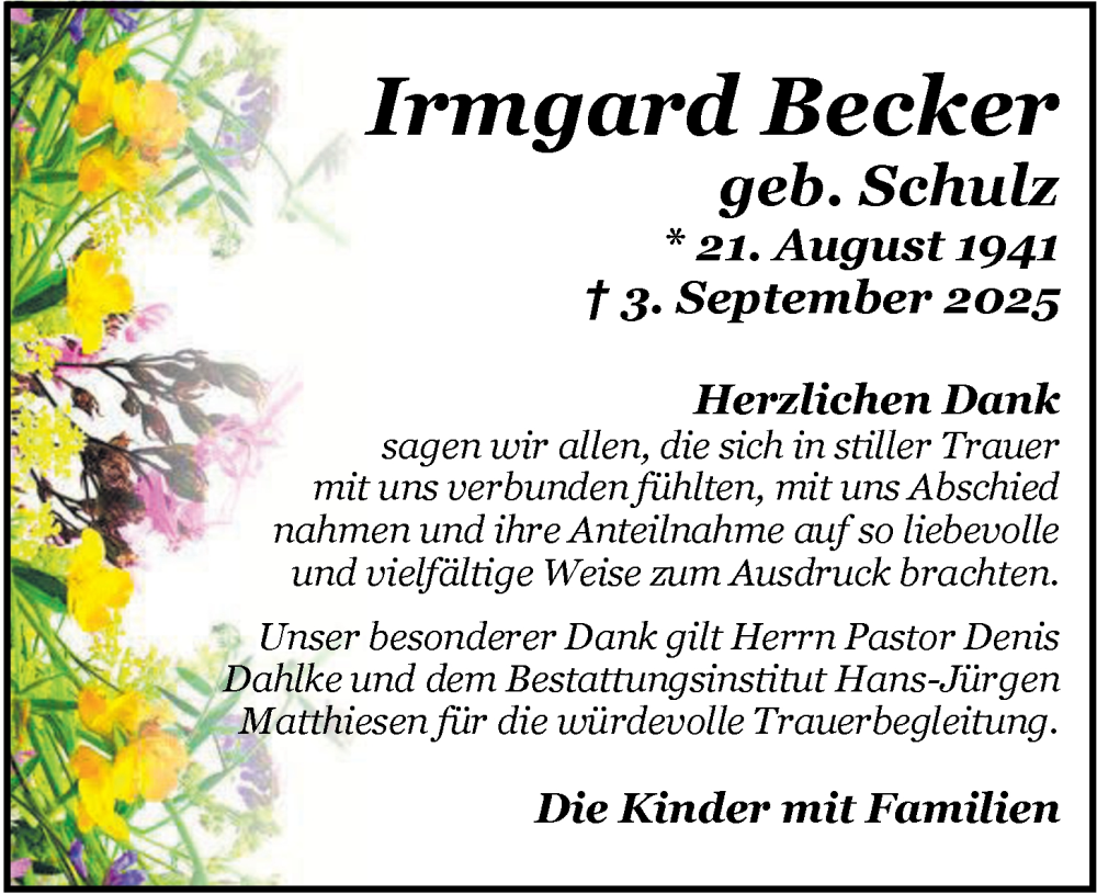 Hier finden Sie alle Traueranzeigen aus der Zeitung, die bisher für Irmgard Becker erschienen sind. Weitere Traueranzeigen, die in der Zeitung erscheinen, werden hier ebenfalls aufgelistet