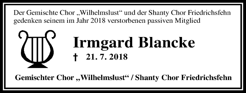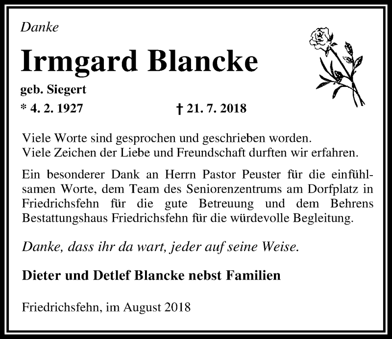Hier finden Sie alle Traueranzeigen aus der Zeitung, die bisher für Irmgard Blancke erschienen sind. Weitere Traueranzeigen, die in der Zeitung erscheinen, werden hier ebenfalls aufgelistet