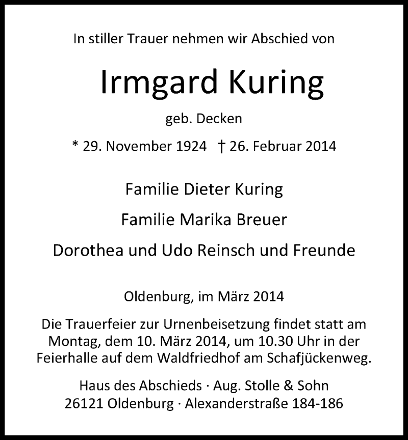 Hier finden Sie alle Traueranzeigen aus der Zeitung, die bisher für Irmgard Kuring erschienen sind. Weitere Traueranzeigen, die in der Zeitung erscheinen, werden hier ebenfalls aufgelistet