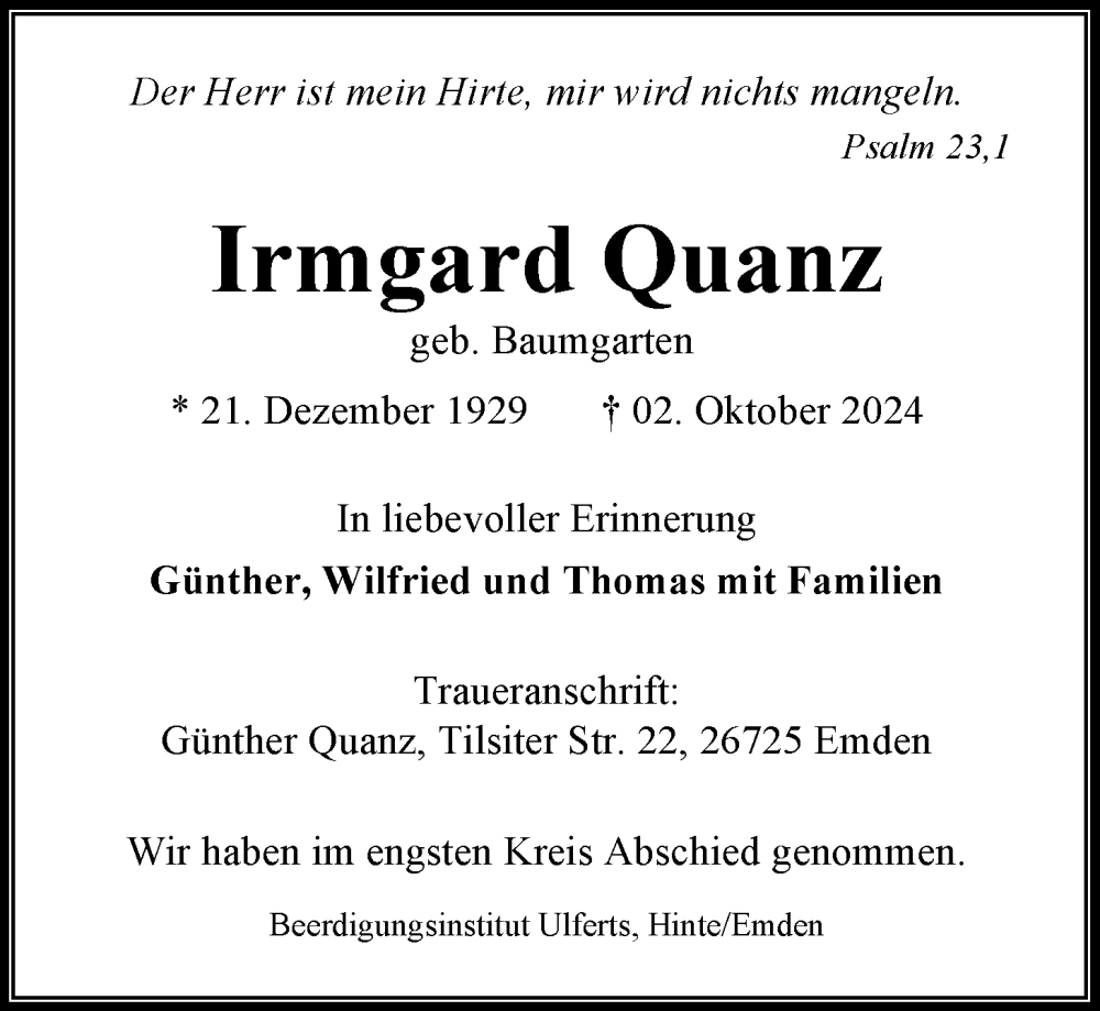 Hier finden Sie alle Traueranzeigen aus der Zeitung, die bisher für Irmgard Quanz erschienen sind. Weitere Traueranzeigen, die in der Zeitung erscheinen, werden hier ebenfalls aufgelistet