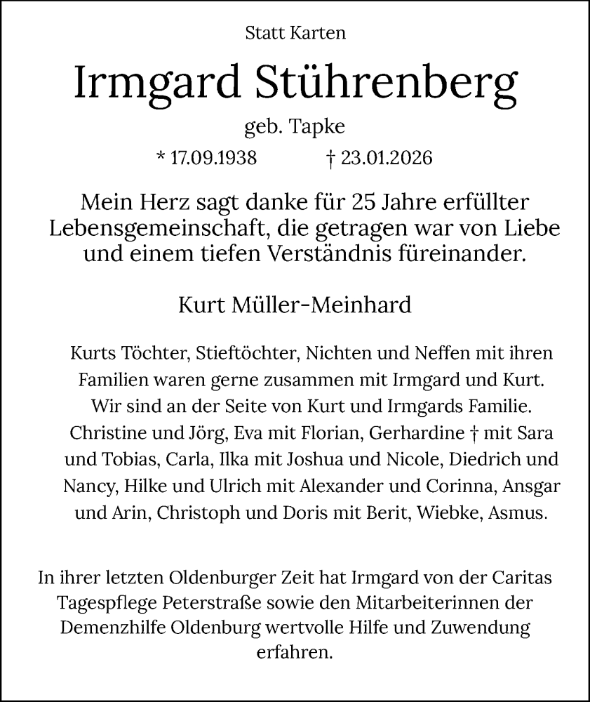 Hier finden Sie alle Traueranzeigen aus der Zeitung, die bisher für Irmgard Stührenberg erschienen sind. Weitere Traueranzeigen, die in der Zeitung erscheinen, werden hier ebenfalls aufgelistet
