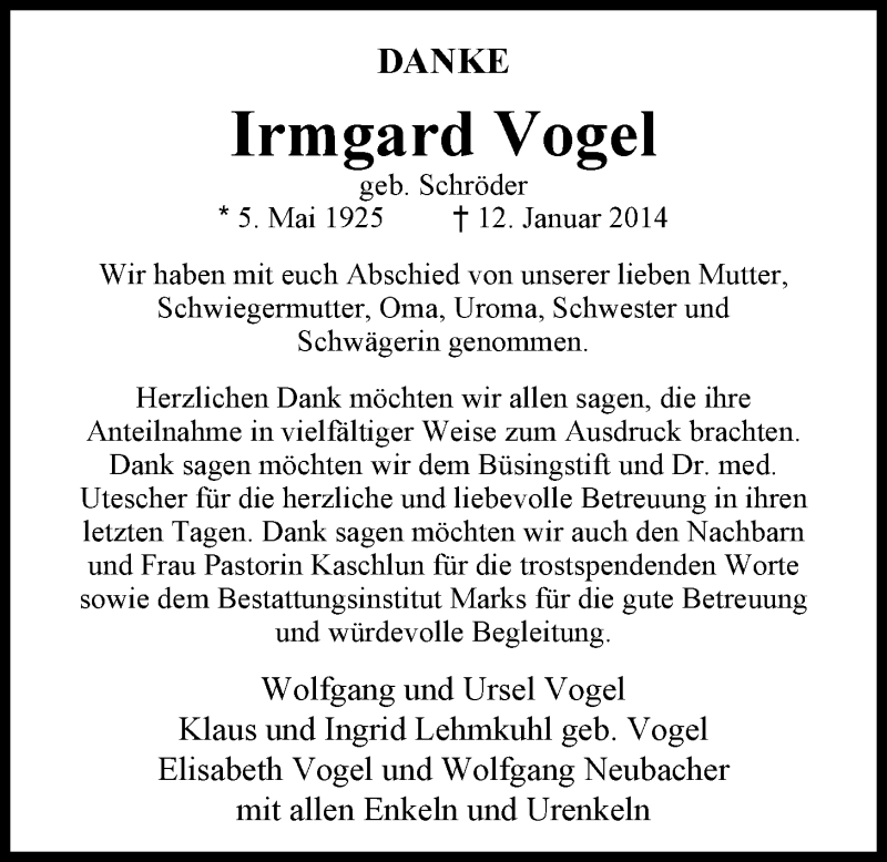 Hier finden Sie alle Traueranzeigen aus der Zeitung, die bisher für Irmgard Vogel erschienen sind. Weitere Traueranzeigen, die in der Zeitung erscheinen, werden hier ebenfalls aufgelistet