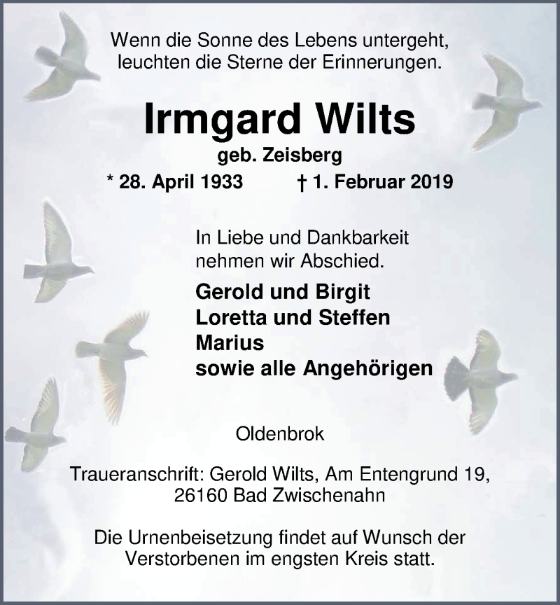 Hier finden Sie alle Traueranzeigen aus der Zeitung, die bisher für Irmgard Wilts erschienen sind. Weitere Traueranzeigen, die in der Zeitung erscheinen, werden hier ebenfalls aufgelistet