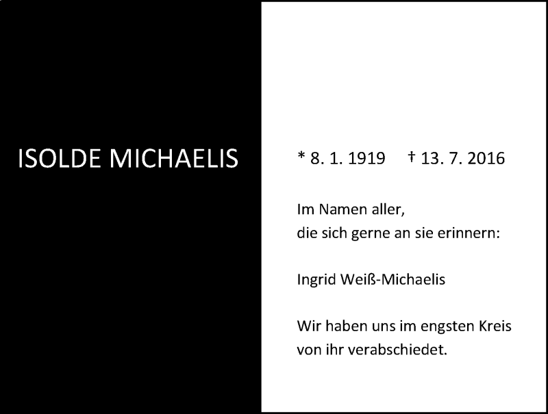 Hier finden Sie alle Traueranzeigen aus der Zeitung, die bisher für Isolde Michaelis erschienen sind. Weitere Traueranzeigen, die in der Zeitung erscheinen, werden hier ebenfalls aufgelistet