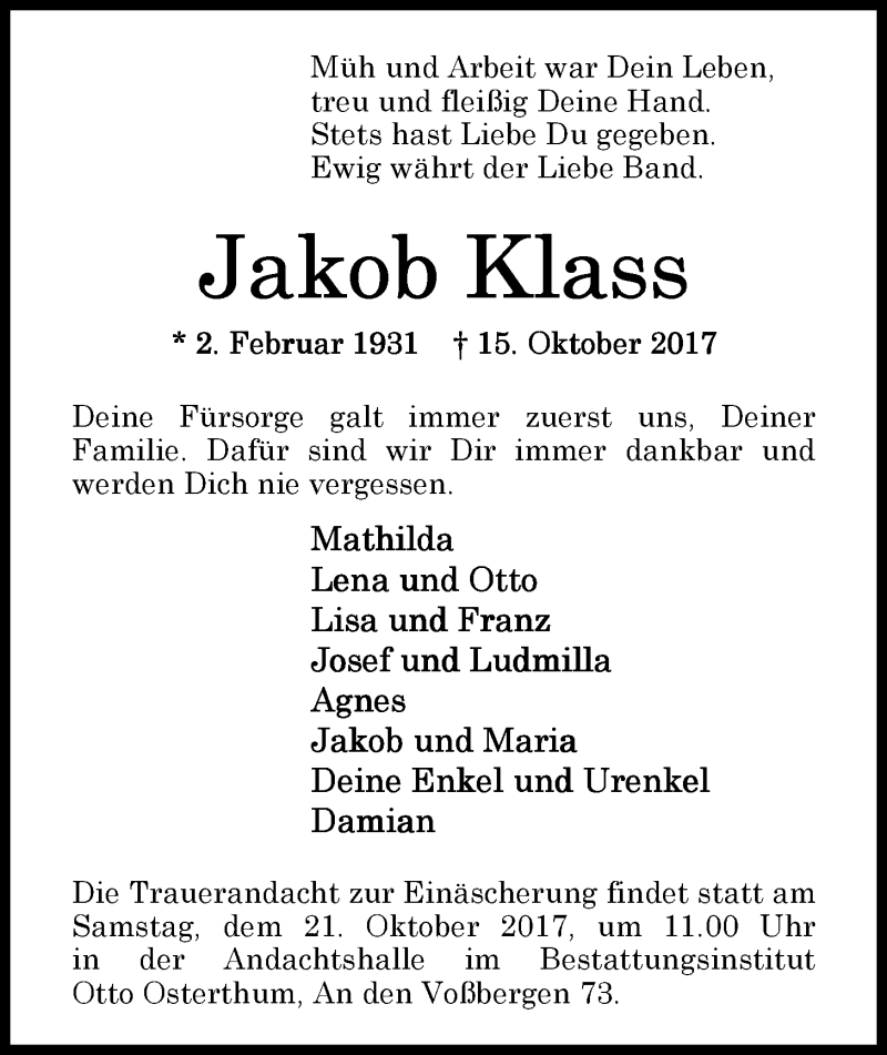 Hier finden Sie alle Traueranzeigen aus der Zeitung, die bisher für Jakob Klass erschienen sind. Weitere Traueranzeigen, die in der Zeitung erscheinen, werden hier ebenfalls aufgelistet